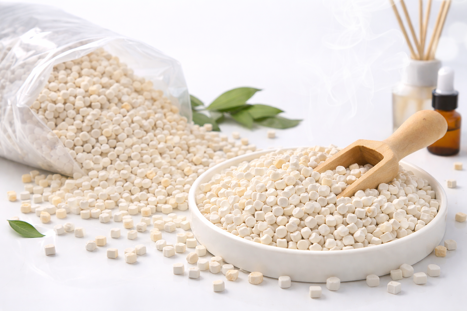 Este aditivo reacciona con los grupos funcionales responsables de la generación del mal olor en resinas recicladas, convirtiéndolos en compuestos no volátiles que no liberan olor.